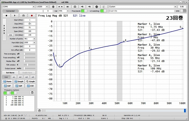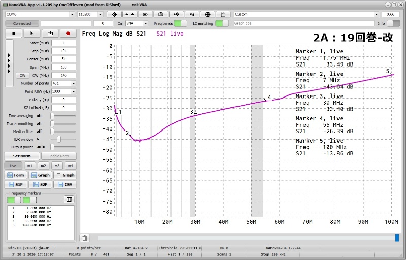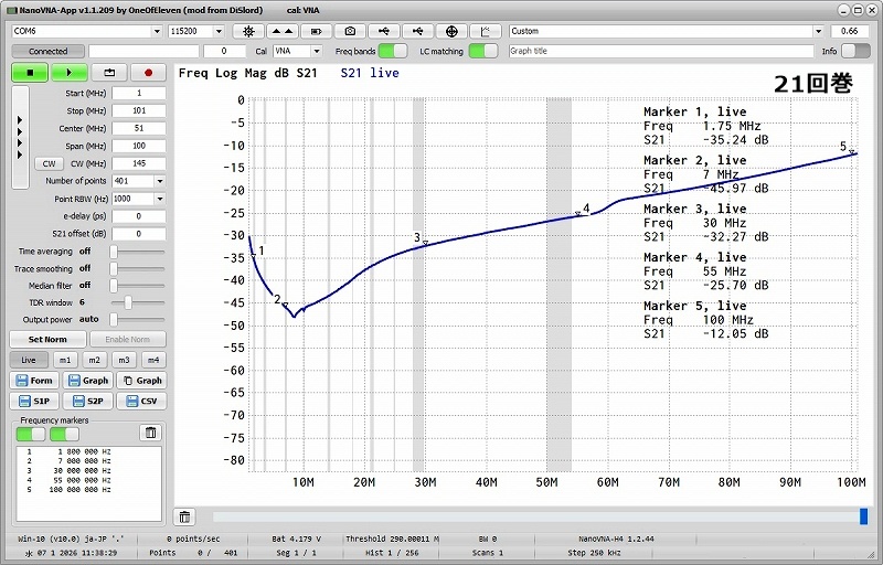 1.21回を超える減衰量を期待しましたが、30MHz辺りでは21回巻より悪くなった気がします。