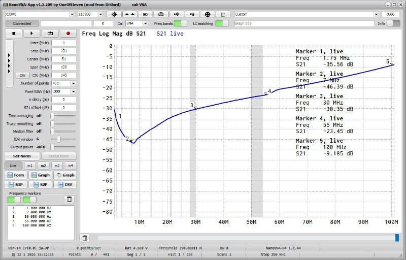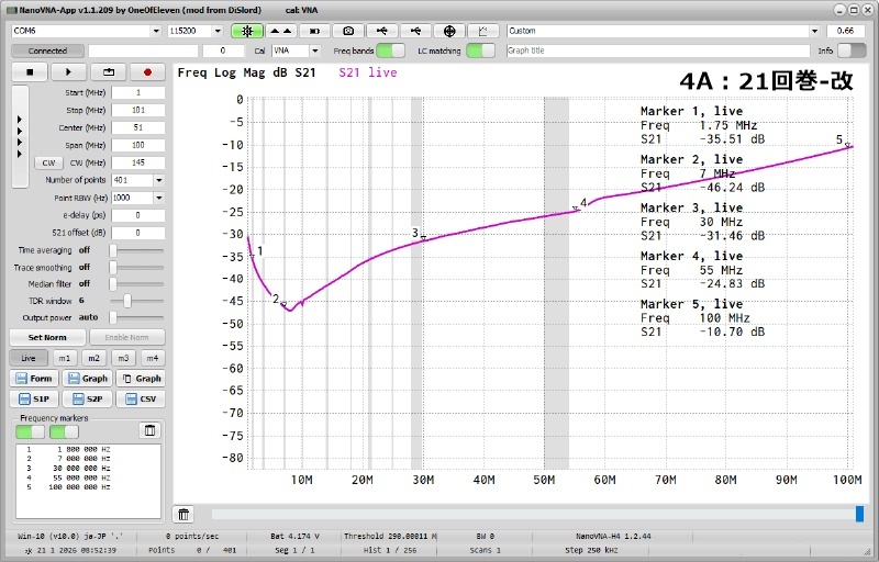 ■.同軸を硬く巻き直した4号機(4A号機)の 1MHz〜101MHzの Log Mag S21特性 (2016/01/20)
