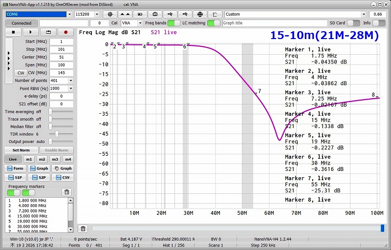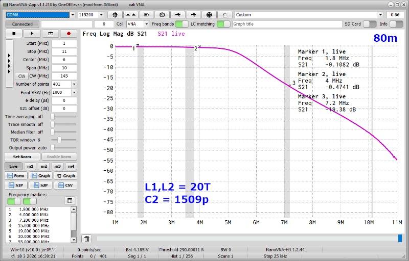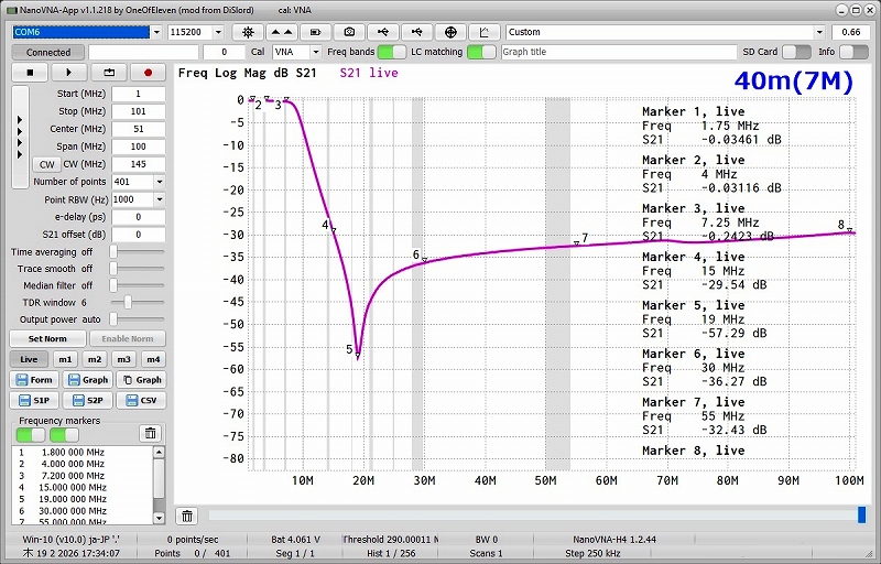 ・Marker3の示すように7MHz帯で-6dB付近の減衰になっており手直しが必要と分かります。