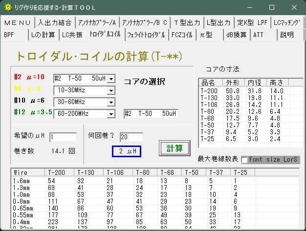 1.JA1HWO 菊地OMのツールで計算上のインダクタンスを確認します。